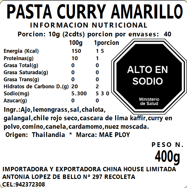 La pasta de curry amarilla es la mezcla de especias tailandesas e indias, en particular cúrcuma, que proporciona el color amarillo. La pasta de curry amarillo NO contiene pasta de camarones y no contiene productos de origen animal (vegetariana).