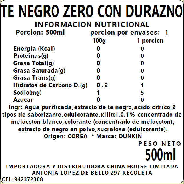 Dunkin Zero Te Negro con Durazno 500ml