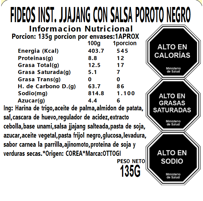 SALSA : Salsa de aderezo Jjajang (pasta de frijoles negros, caramelo, sal), oligosacárido, agua, polvo de condimento Jjajang (pasta de frijoles negros, caramelo, sal), azúcar, aceite de maíz, extracto de yeste en polvo, aceite de cebolla, polvo de cebolla, 5'-guanilato de disodio, [polvo de aceite de palma, polvo de caramelo, aceite de sésamo, sal, polvo de jengibre, proteína vegetal texturizada (soja, trigo), repollo, cebolla, papa frita.