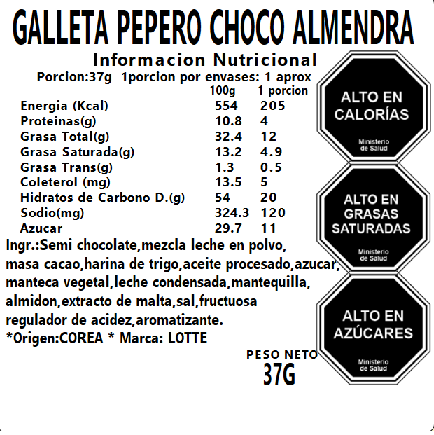 Semi chocolate, azucar, aceite procesado, leche entera en polvo, masa de cacao, lactosa, harina de trigo, almendra, semi chocolate 2, manteca vegetal, mantequilla condensada procesada, almidon, extracto de malta, sal refinada, acidez de regulador, agente mixto, extracto de vainilla, saborizantes, levadura.
