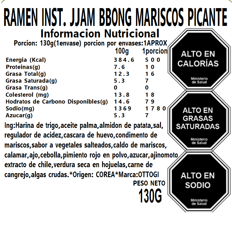 Salsa : Agua, Pasta de condimento Jjambbong (3.3%) [Sepia, Camarón, Pimentón, Ajo, Sal, Potenciador del sabor (635)], Salsa de condimento de mariscos [Sepia, Mejillón, Bacalao, Cangrejo, Sal, Potenciador del sabor (635)], Extracto de sepia, extracto de algas en polvo (algas, sal, ostra), extracto de mejillón en polvo, proteína vegetal hidrolizada (de soja, trigo, maíz), extracto de ascidia verrugosa, extracto de levadura, extracto de sepia en polvo, ajo, pimiento rojo, cebolla, azúcar , Extracto de mejillón, condimento para mariscos en polvo (sepia, camarones, sal), maltodextrina, colorante (160c), sal.