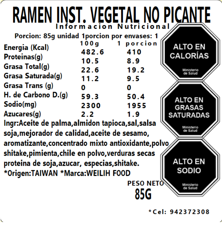 Harina de Trigo. aceite de palma, sal, salsa de soya, aceite de sésamo, saborizante artificial, verdura deshidratada, vinagre, proteína de soya, agua, glutamato de sodio, gluten de sodio, canela, comino, nueces, anís, apio, pigmento rojo, extracto de chile, aceite de girasol,