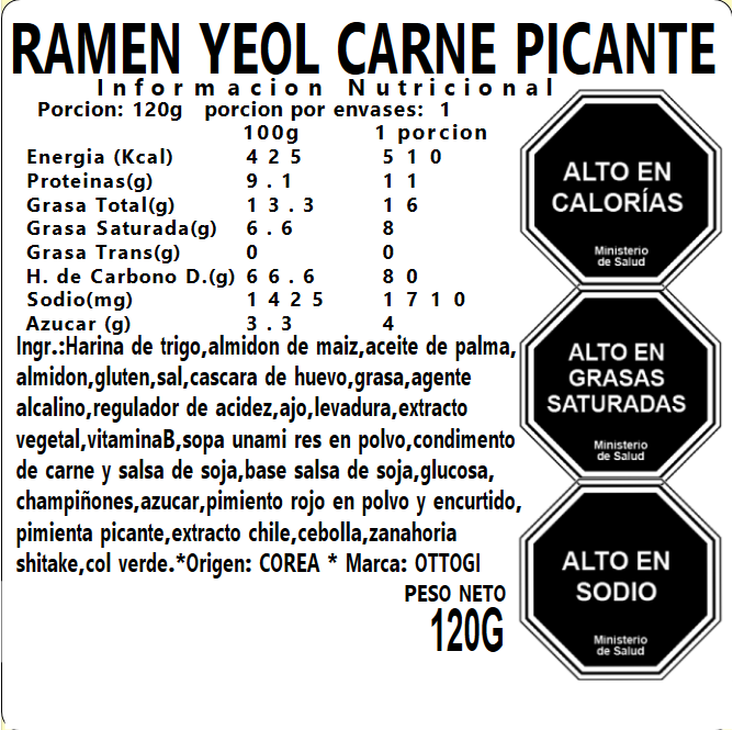 Sopa de fideo instantánea sabor verduras picante INGREDIENTES : Harina de trigo, Almidón, Aceite de palma, Sal, Polvo de cascara de huevo, Aceite emulsionado y fideos, Ajo en polvo, Extracto de levadura, Extracto vegetal dulce, Aceite aromatizante de te verde, Carne en polvo, Condimento en polvo para carne, Salsa de soya en polvo, Pimienta rojo en polvo, Ají en polvo, Caballo, Cebolla seca, Zanahoria seca, Hongo shitake seco, Pak Choi Seco,