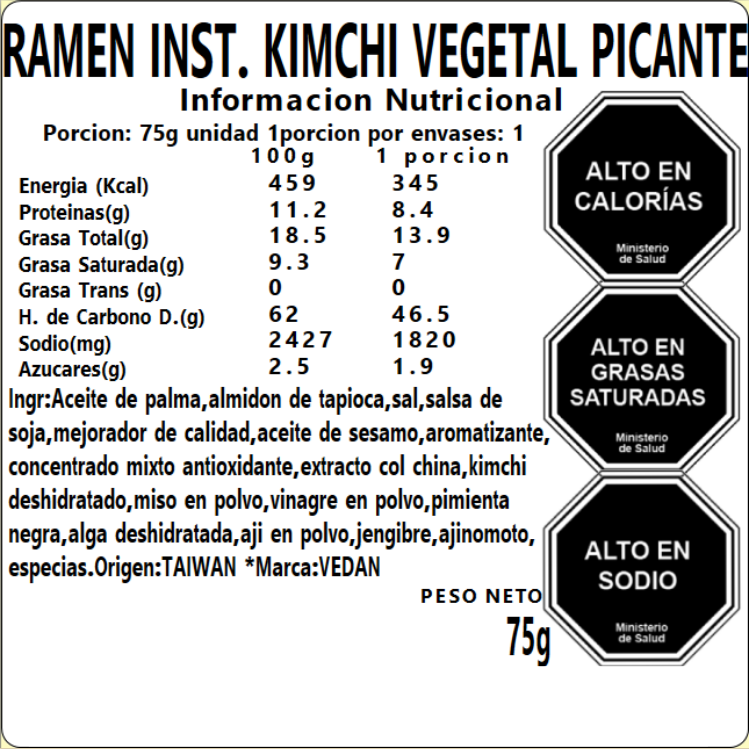 Harina de trigo, sal, condimentos, glutamato monosodico,aceite de soya, acidos grasos, extracto de satoshi de malta, rodajas de kimchi (Repollo chino fermentado picante), aji en polvo, cebolla, pimiento rojo deshidratado, vinagre blanco, brotes de alga.
